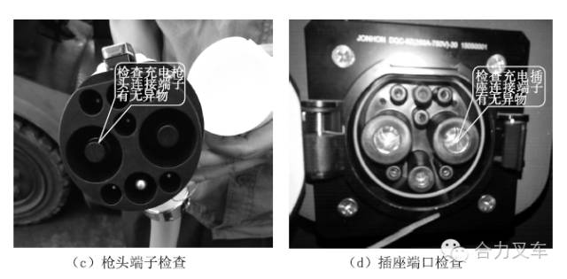 請選用合力指定的專用鋰電池充電設(shè)備進(jìn)行充電,并嚴(yán)格遵照所用充電設(shè)備的《使用維護(hù)說明書》要求進(jìn)行操作?! りP(guān)掉鑰匙開關(guān)后充電; ·請選擇在相對較安全的環(huán)境下充電(如避免有液體、火源等環(huán)境); ·充電設(shè)備周圍需配備必要的安全滅火裝置,以便在出現(xiàn)極端情況下可以進(jìn)行緊急滅火處理; ·充電前需確認(rèn)充電槍及充電插座里沒有粉塵、積水等異物,如有異物需將其清理完畢方可充電,否則會導(dǎo)致充電槍及充電插座接觸不良從而產(chǎn)生發(fā)熱甚至引起火災(zāi); ·不要修改或拆卸充電端口和充電設(shè)備,這樣可能導(dǎo)致充電故障,引起火災(zāi); ·充電結(jié)束后,不要以濕手或站在水里時去斷開充電設(shè)備,因?yàn)檫@樣可能引起電擊,造成人身傷害; ·充電結(jié)束后,請關(guān)閉車輛充電端口保護(hù)蓋,避免充電口在車輛運(yùn)行過程中進(jìn)入異物,因?yàn)檫@樣會導(dǎo)致充電口損毀?! ぎ?dāng)電池電量低于20%時,應(yīng)及時補(bǔ)充充電,嚴(yán)禁電池過放電; ·電池使用后應(yīng)立即充電,充電應(yīng)充滿,但嚴(yán)禁過充電; ·為避免對充電設(shè)備造成破壞,請注意以下幾項: a)不要在充電端口保護(hù)蓋打開的狀態(tài)下關(guān)閉充電端口艙門; b)不要用力拉或者扭轉(zhuǎn)充電電纜; c)不要使充電設(shè)備承受撞擊; d)不要在溫度高于55℃的環(huán)境下使用充電設(shè)備; e)禁止在充電設(shè)備有電流輸出時直接插拔充電槍,這樣可能會導(dǎo)致電拉弧現(xiàn)象, 造成財產(chǎn)損失及人身傷害; f)不要把充電設(shè)備放在靠近加熱器或者其他熱源的地方。 充電操作步驟: 步驟一:充電準(zhǔn)備 ?。?)確保待充電車輛鑰匙開關(guān)處于關(guān)閉狀態(tài),即整車不帶電,如圖(a)所示; ?。?)從充電設(shè)備上取下充電槍頭(注意:充電槍頭上集成有按鈕鎖扣如圖(b)必須按下才可進(jìn)行正常拔插操作),檢查充電槍及車輛端的鏗電池充電插座,確保端口內(nèi)沒有水或外來物,及金屬端子沒有生銹或者腐蝕造成的破壞或者影響,如圖(c),(d)所示;